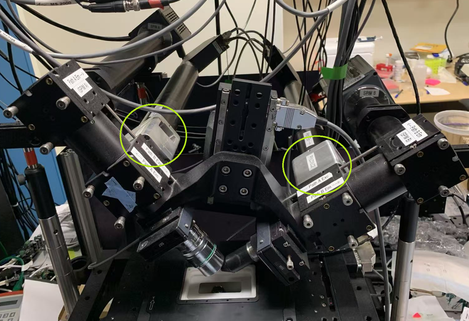 The diSPIM microscope has two imaging paths that meet at a right angle on the sample, allowing researchers to illuminate and image the sample from both perspectives. This dual view can compensate for the poor depth resolution of any single view, and illuminate with more control over polarization than other microscopes.