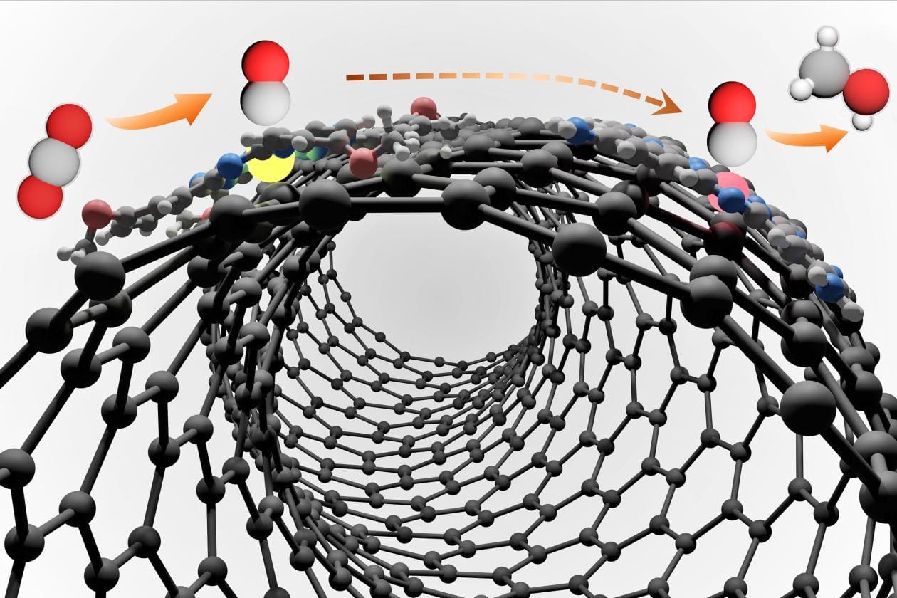 The new process starts with a nickel tetramethoxyphthalocyanine site for the conversion of CO2 into CO. The newly formed CO then migrates onto a cobalt site — catalysis scientists refer to this as “spillover” — to complete the reduction into methanol.