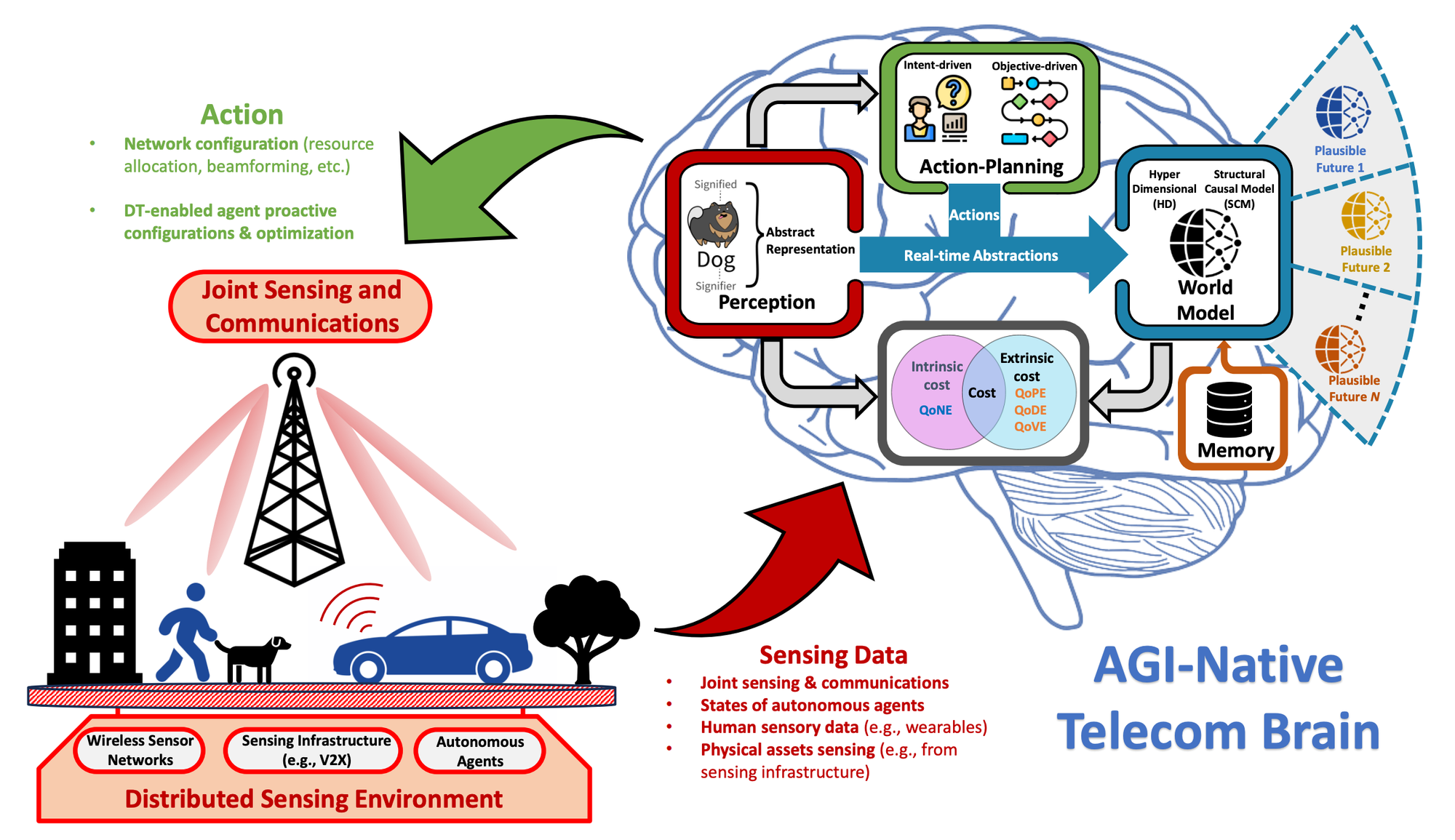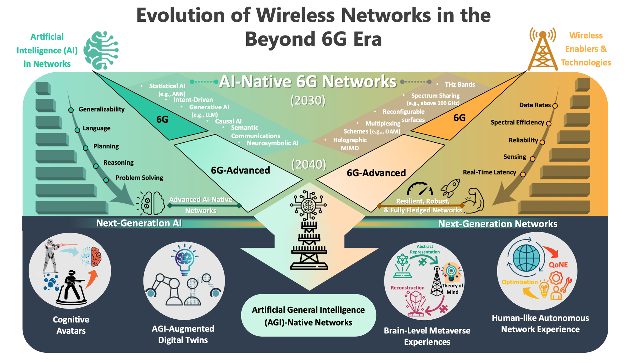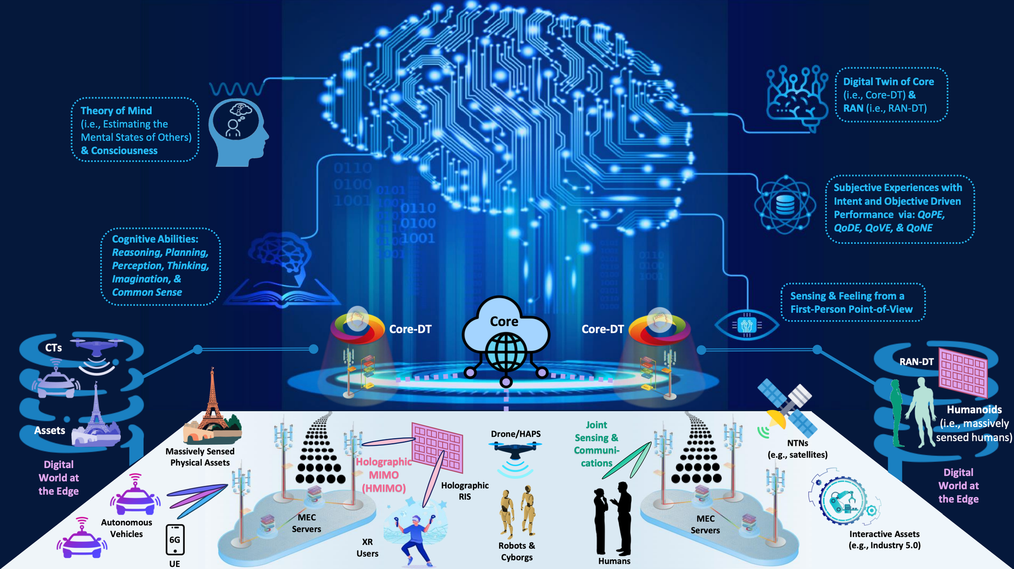 Instead of incremental advances to known wireless technologies, the researchers propose a paradigm shift. This shift would surpass the AI-native wireless system anticipated with 6G and aspire to a system that is equipped with human levels of intelligence — intelligence that is learned at the intersection of the digital world and future wireless networks Then, this AGI-native network is set to endow some of its common sense abilities to digital twins, thereby unleashing a new breed of human-like AI agents.
