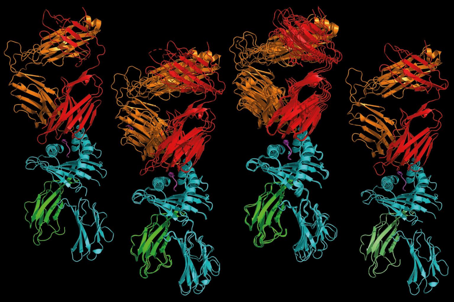 A T cell receptor that recognizes a human protein fragment (left) is remarkably similar to one that recognizes a bacterial protein fragment (right), and to two receptors capable of recognizing both human and bacterial protein fragments (middle). This supports the idea that some T cells that react to microbes also may react to normal human proteins, causing autoimmune disease. The findings promise to accelerate efforts to improve diagnostic tools and treatments for autoimmune diseases.