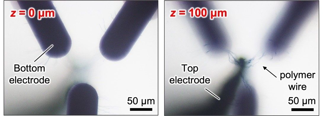 The researchers were able to grow polymer wires from a common polymer mixture called ‘PEDOT:PSS’, which is highly conductive, transparent, flexible, and stable. A 3D structure of top and bottom electrodes was first immersed in a precursor solution. The PEDOT:PSS wires were then grown between selected electrodes by applying a square-wave voltage on these electrodes, mimicking the formation of synaptic connections through axon guidance in an immature brain.