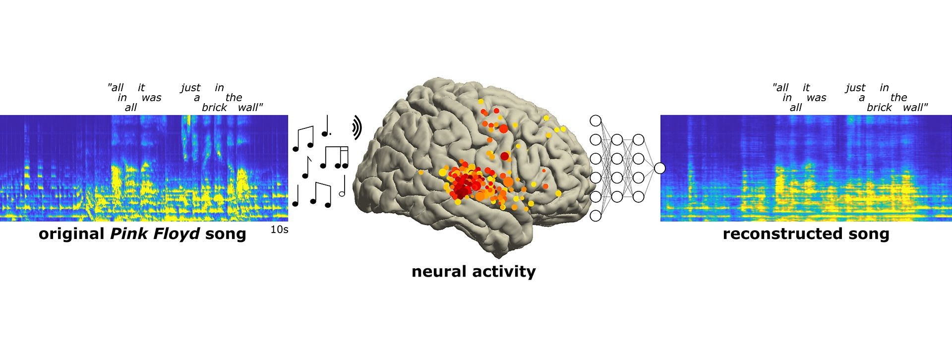 The phrase "All in all it was just a brick in the wall" comes through recognizably in the reconstructed song, its rhythms intact, and the words muddy, but decipherable. This is the first time researchers have reconstructed a recognizable song from brain recordings.