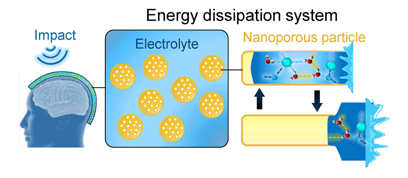 By manipulating the mechanical properties of materials — integrating nanoporous materials with “non-wetting liquid” or ionized water — the team developed a way to make a material that could respond to impacts in a few microsecondsbecause this combination allows for superfast liquid transport in a nanoconfined environment. Also, upon unloading, i.e., after impacts, due to its non-wetting nature, the liquid nanofoam cushion can return to its original form because the liquid is ejected out of the pores, thereby withstanding repeated blows. This dynamic conforming and reforming ability also remedies the problem of the material becoming rigid from micro-impacts.