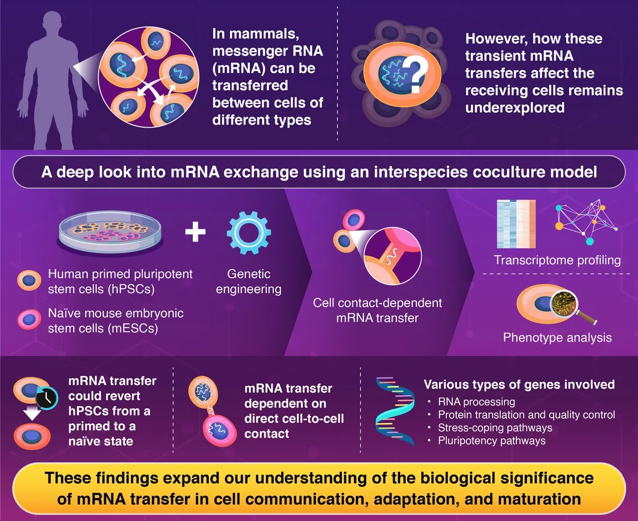 Next, the researchers investigated the biological effects that this transferred mRNA had on the receiving cells. Notably, they found that primed hPSCs could be reverted to a so-called “naïve” state. In other words, the human cells reverted to an earlier embryonic stage in their differentiation. This suggests that mRNA moving between different mammalian stem cells has biologically significant effects beyond mere movement, going as far as cell fate conversion. The team also identified several key transcription factors involved in this process, with essential functions for pluripotent state maintenance.