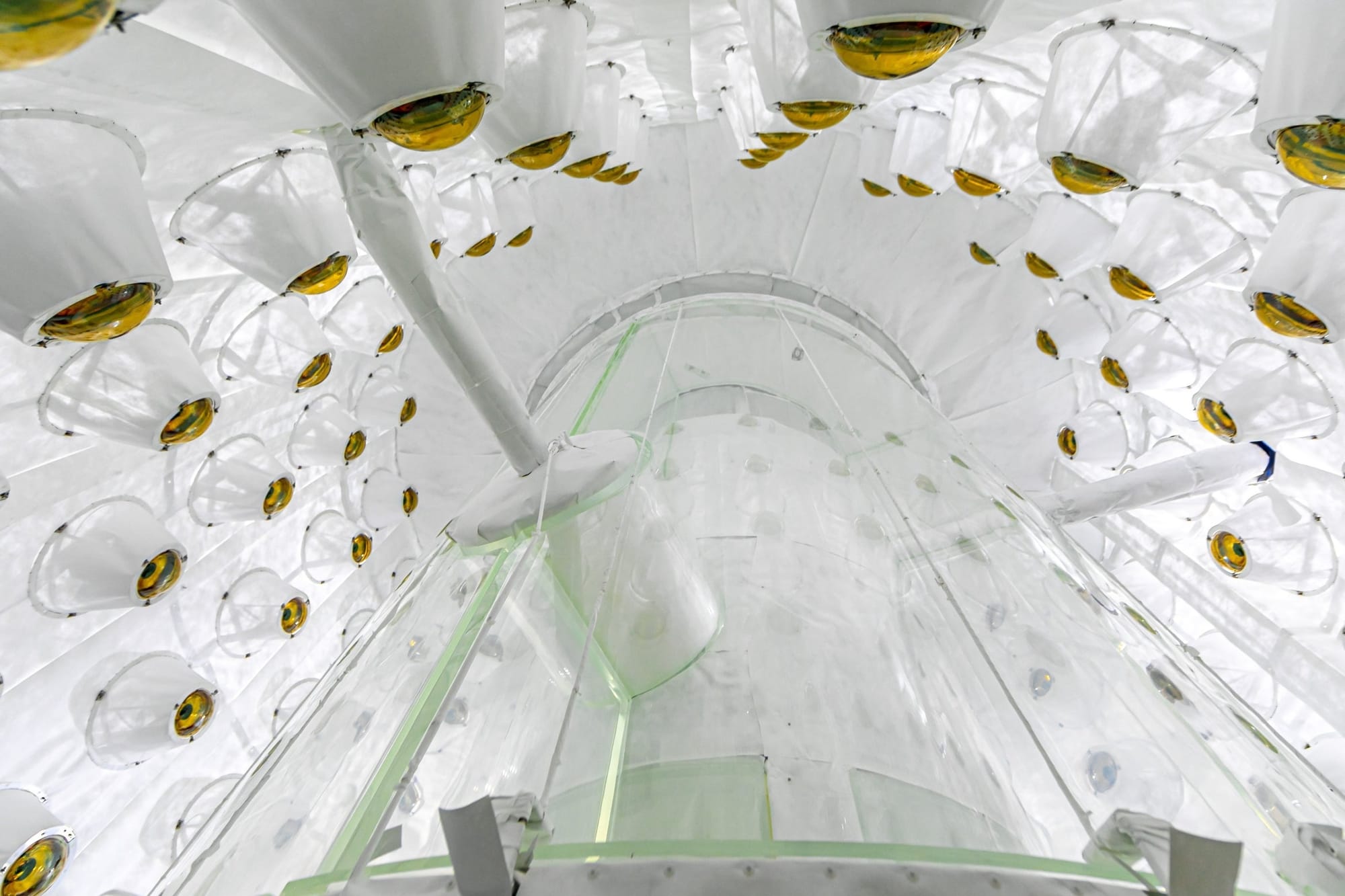 The inner portion of the LZ detector consists of two nested titanium tanks filled with ten tonnes of transparent pure liquid xenon, which is so dense it creates a highly isolated environment, free from the “noise” of the outside world and perfect for capturing the faintest of faint signals that could be indicative of a WIMP. The hope is for a WIMP to knock into a xenon nucleus, causing it to move, much like a hit from a cue ball in a game of pool. By collecting the light and electrons emitted during interactions, LZ captures potential WIMP signals alongside other data. This liquid xenon core is surrounded by a much larger Outer Detector (OD) — acrylic tanks filled with gadolinium-loaded liquid scintillator.