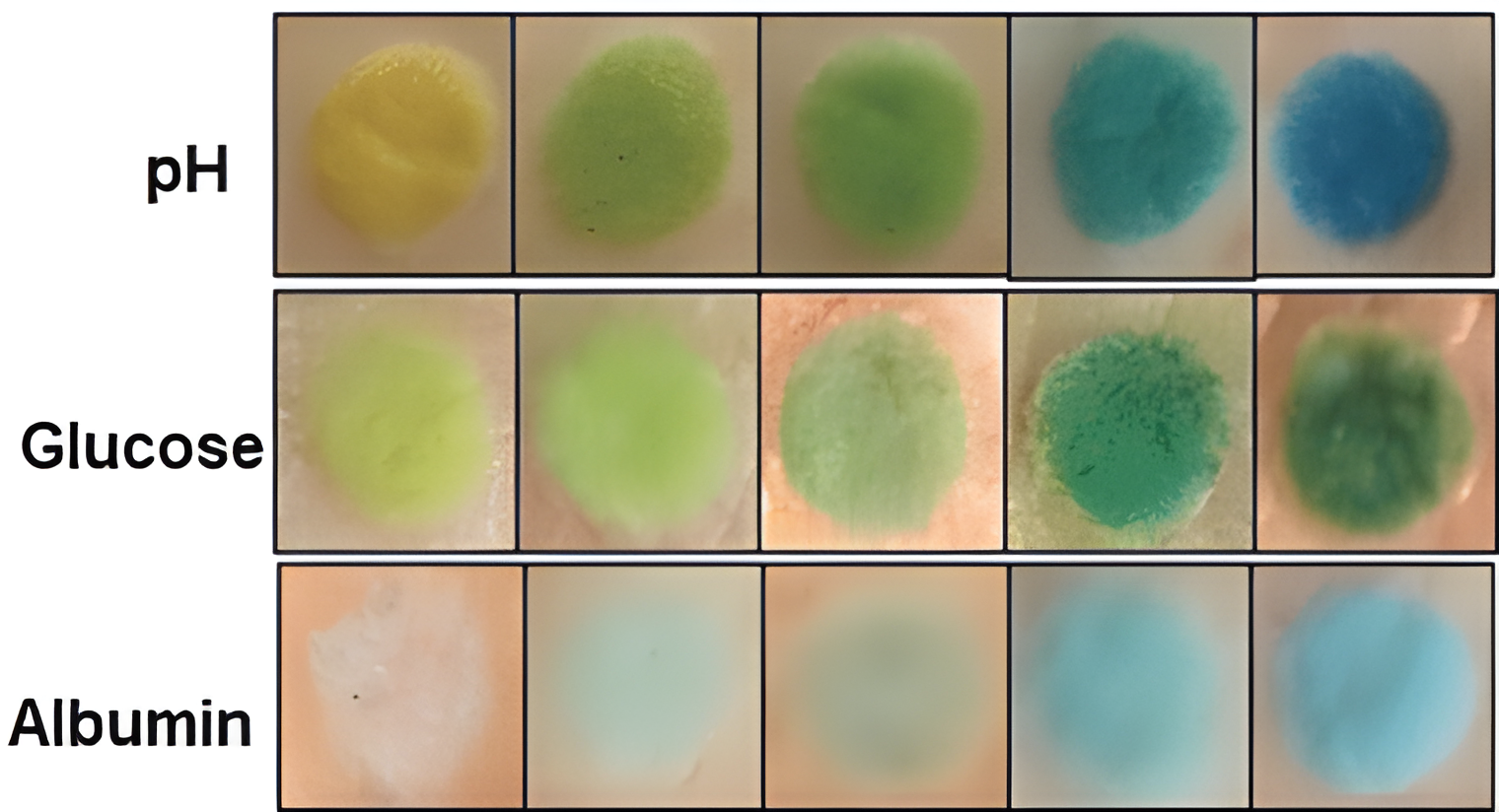 The other two sensors probed the levels of glucose and albumin. Albumin is a carrier and transport protein in the blood. High glucose levels in the body may indicate diabetic dysfunction, whereas falling albumin levels can indicate liver or kidney failure. The glucose sensor consisted of the enzymatic reactions of glucose oxidase and peroxidase, which, depending on the glucose concentration, led to a structural change of an organic pigment, and a yellow to dark green color change. The albumin sensor was based on a yellow dye that, upon association with the albumin protein, turned green.