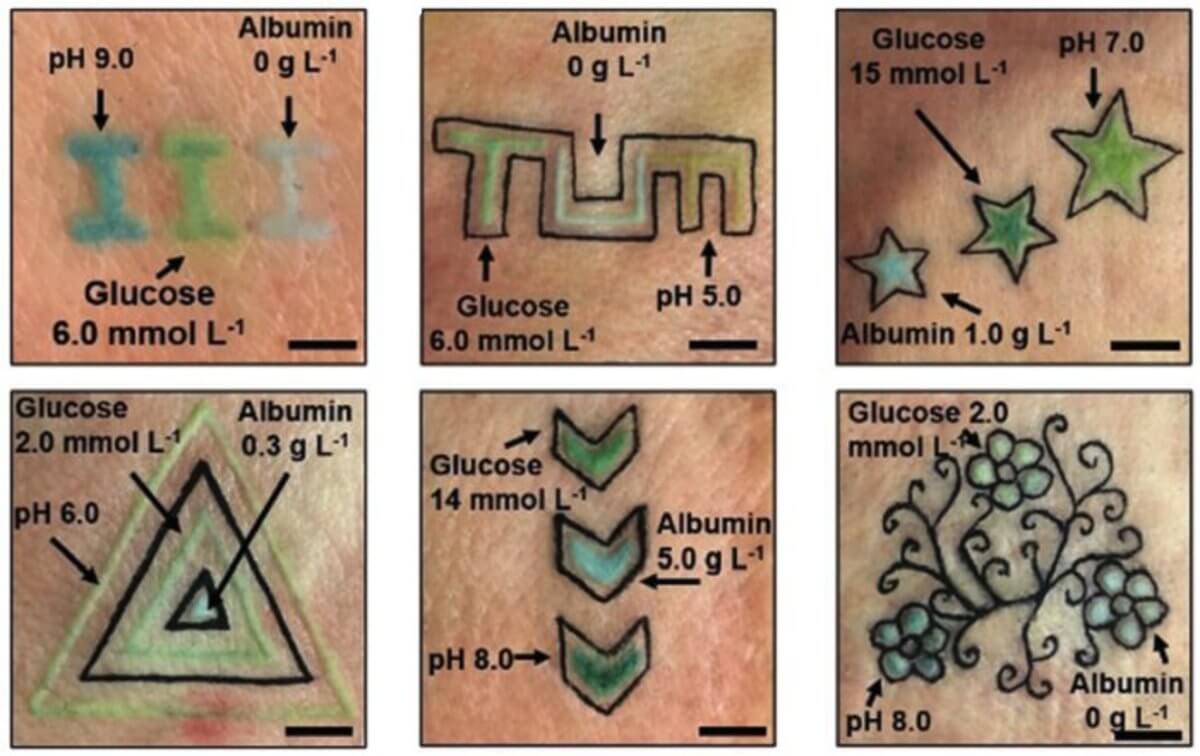 As detailed in the journal Angewandte Chemie, a colorimetric analytic formulation was injected into the skin instead of tattoo ink. The pigmented skin areas varied their color when blood pH or other health indicators changed.