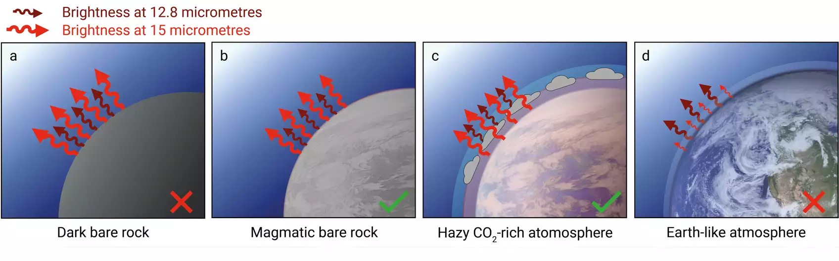 The two observational programmes, which complement each other in the current study, were designed to measure the brightness of Trappist-1 b at different wavelengths in the thermal infrared range (12.8 and 15 micrometres). The first observation was sensitive to the absorption of the planet’s infrared radiation by a layer of CO2. However, no dimming was measured, leading the researchers to conclude that the planet has no atmosphere.