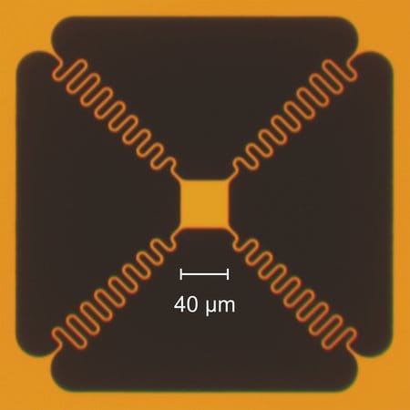 The researchers used equipment in the Kavli Nanoscience Institute at Caltech and a technique called electron beam lithography to carefully pattern a membrane of silicon nitride just 50 nanometers thick, creating something that looks like a microscopic trampoline. The mini trampoline, a square just 40 microns wide and 40 microns long, is suspended at the corners by silicon nitride springs. Then the team hit the membrane with argon laser light at a visible wavelength. The goal was to measure the radiation pressure that the miniature lightsail experienced by measuring the trampoline's motions as it moved up and down.