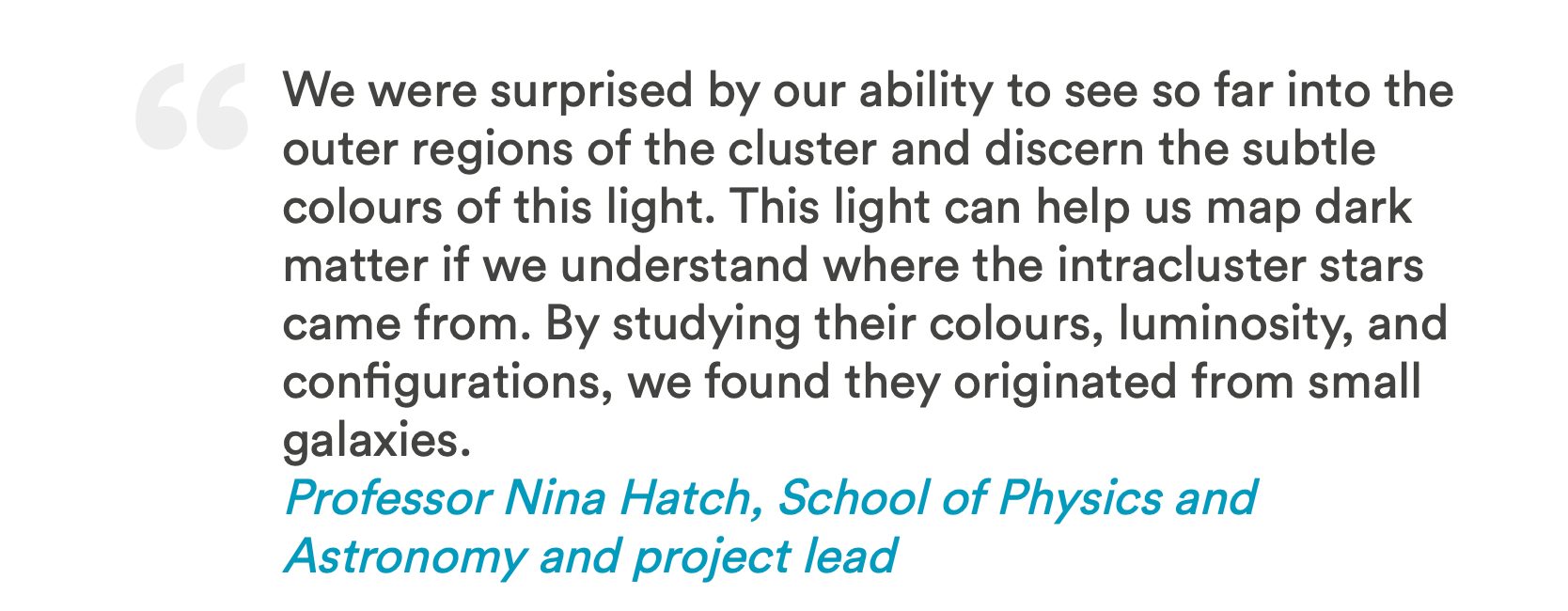 Dr Matthias Kluge, from the Max-Planck institute for Extraterrestrial Physics in Munich, Germany, stated: "This diffuse light is more than 100,000 times fainter than the darkest night sky on Earth. But it is spread over such a large volume that when we add it all up, it accounts for about 20% of the luminosity of the entire cluster."