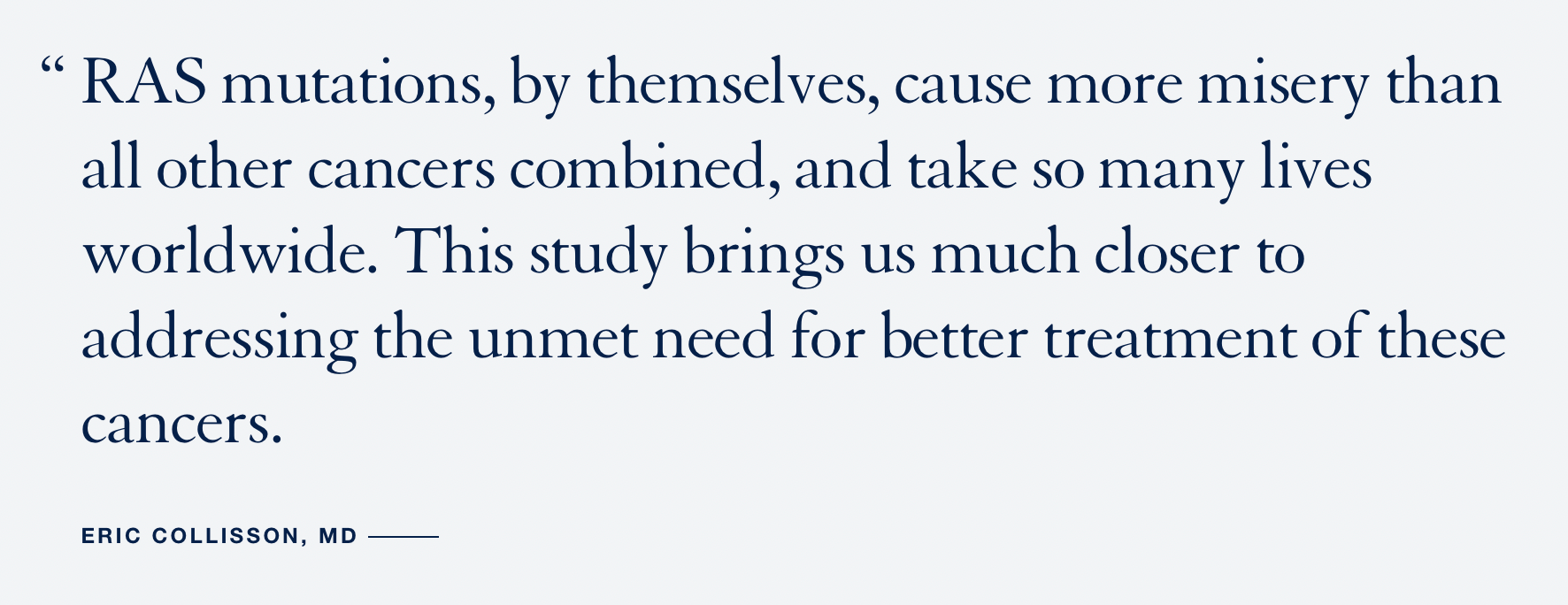 “RAS mutations, by themselves, cause more misery than all other cancers combined, and take so many lives worldwide,” said Eric Collisson, MD, a senior author of the study and member of the UCSF Helen Diller Family Comprehensive Cancer Center. “This study brings us much closer to addressing the unmet need for better treatment of these cancers.”