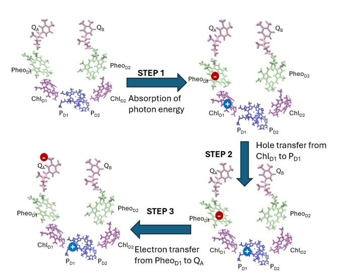 In this study, the researchers used a combination of molecular dynamics simulations, quantum mechanical calculations, and Marcus theory (a Nobel Prize-winning framework for electron transfer) to map the energy landscape for electron movement in both branches. “We assessed the electron transfer efficiency step-by-step through both D1 and D2 branches,” says Shubham Basera, PhD student in the Department of Physics and one of the authors.