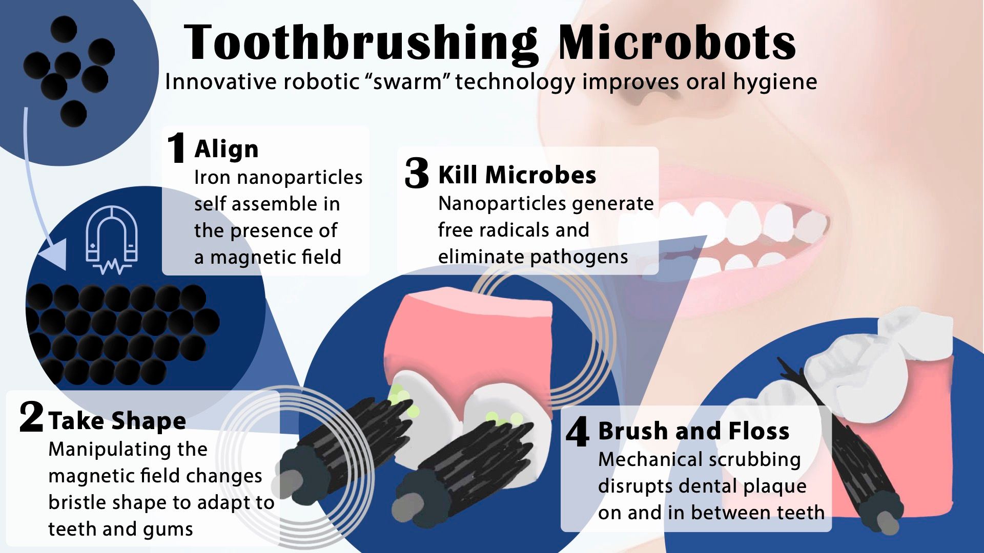 The building blocks of these microrobots are iron oxide nanoparticles that have both catalytic and magnetic activity. Using a magnetic field, researchers could direct their motion and configuration to form either bristle-like structures that sweep away dental plaque from the broad surfaces of teeth, or elongated strings that can slip between teeth like a length of floss. In both instances, a catalytic reaction drives the nanoparticles to produce antimicrobials that kill harmful oral bacteria on site.