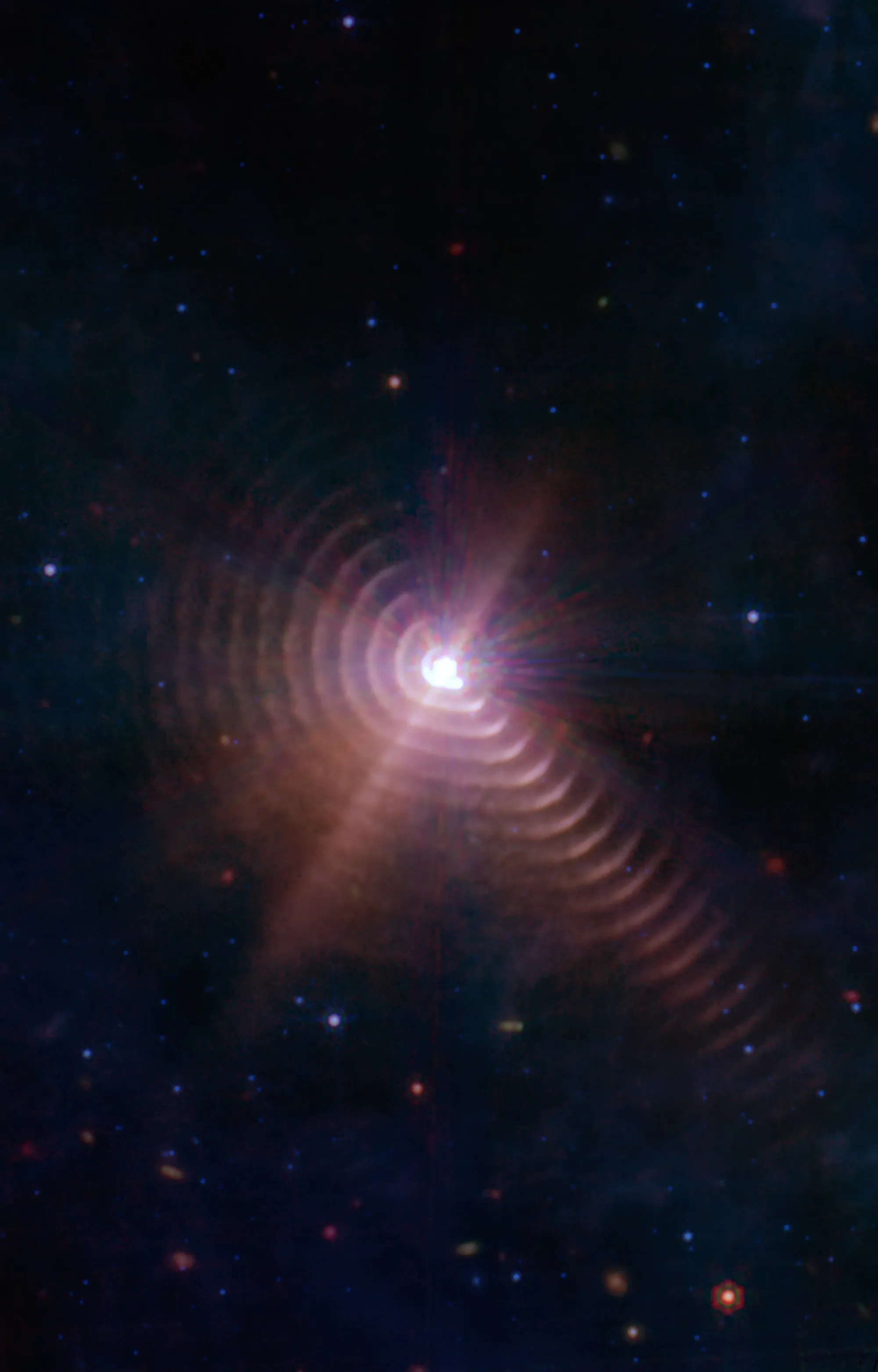 In a complementary study of WR140, published in Nature Astronomy, NASA's James Webb Space Telescope (JWST) was able to see much deeper to snap an image of not just a single accelerating dust plume, but almost 20 of them, nested inside each other like a giant set of onion skins.